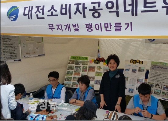 ▲ 소비자 문제 상담, 에너지절약 서명운동,‘팽이만들기 체험’행사 전개하고 있는 도정자 대전소비자공익네트워크 회장.