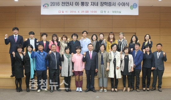 시는 이·통장 자녀 중 학업성적이 우수하거나 기능·예·체능에 소질과 재능이 뛰어난 고등학생 34명을 선발하고, 29일 오전 10시 시청 대회의실에서 ‘2016년 천안시 이·통장 자녀 장학증서 수여식’을 가졌다.