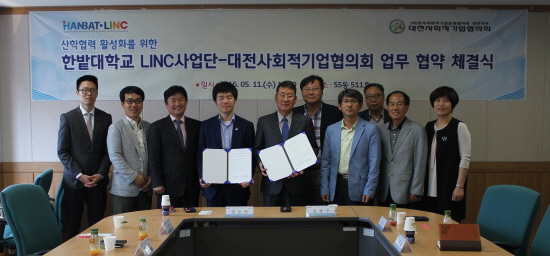 한밭대학교 산학협력선도대학육성사업단(단장 김광주, 이하 LINC사업단)는 11일(수) 대전사회적기업협의회(협회장 장능인)와 ‘산학협력 활성화를 위한 업무협약’을 체결했다고 밝혔다.