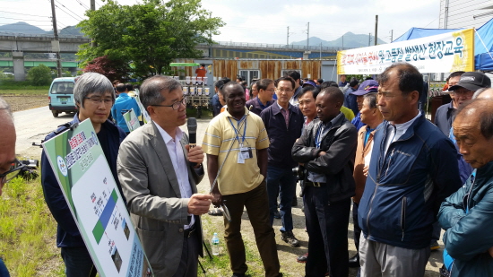 충남 아산시(시장 복기왕)와 국립한국농수산대학(총장 김남수)은 최근 쌀 소비감소와 가격하락으로 어려움을 겪고 있는 쌀 생산 농가들의 실질적인 소득증대를 위하여 13일 쌀전업농회원 등 농업인 100여명이 참석한 가운데 벼 직파 신기술 연시회 및 현장기술교육을 실시했다고 밝혔다.