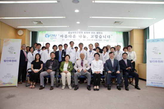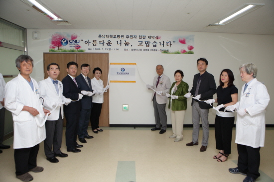 이날 행사에는 김봉옥 병원장, 박종윤 회장 및 전지민 부회장과 가족들, 이철호 충남대학교병원 발전후원회장 등 후원자와 병원관계자 20여명이 참석하여 후원자 현판 제막을 축하하였다.