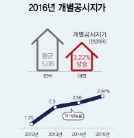 시에 따르면 금년도 개별공시지가는 갑천 친수구역 등 개발사업지역 등에 대한 개발 기대심리와 실거래가격과 공시지가의 격차율 해소를 위한 조정 등으로 전년대비 평균 3.22%(전국 평균 5.08%)가 상승하였으며, 구별로는 서구(3.53%↑), 유성구(3.29%↑), 동구(3.13%↑), 대덕구(3.05%↑), 중구(2.68%↑)순으로 상승한 것으로 나타났다.