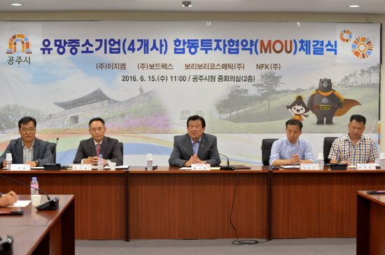 충남 공주시(시장 오시덕)는 15일 공주시청 중회의실에서 오시덕 시장을 비롯한 ㈜이지켐 등 4개 기업 대표 및 임직원이 참석한 가운데 합동 투자협약을 맺었다고 밝혔다.