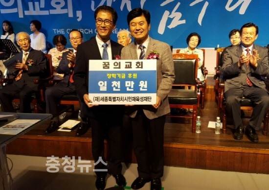 세종시 노을3로에 자리한 꿈의 교회(담임목사 안희묵)가 19일 이춘희 세종시 인재육성재단 이사장에게 1천만 원의 장학금을 기탁했다.