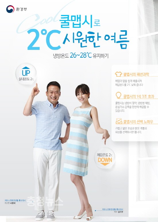 간편하고 시원한 쿨맵시 옷차림은 체감온도를 2도 정도 낮추는 효과가 있어 냉방에너지를 절약하고 냉방병 예방, 온실가스 1인 1톤 줄이기에 기여한다.