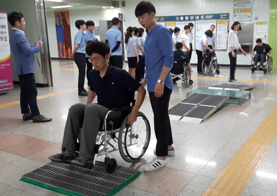 참여자들은 국립 재활원의 전문 강사로 부터 장애인 인식개선에 대한 이론 교육을 들은 뒤 휠체어와 지팡이를 이용, 대합실을 이동하면서 지체 장애와 시각 장애를 체험했다.