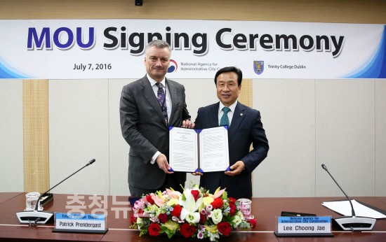지난 4월 11일 행복도시를 방문한 쥴리엣 핫세(Dr. Juliette Hussey)트리니티대학 부총장 일행이 다녀간지 3달만에 패트릭 프랜더개스트(Dr. Patrick Prendergast) 총장이 다시 방한해 7일 7일 이충재 행정중심복합도시건설청장과 양해각서(MOU)를 체결했다.