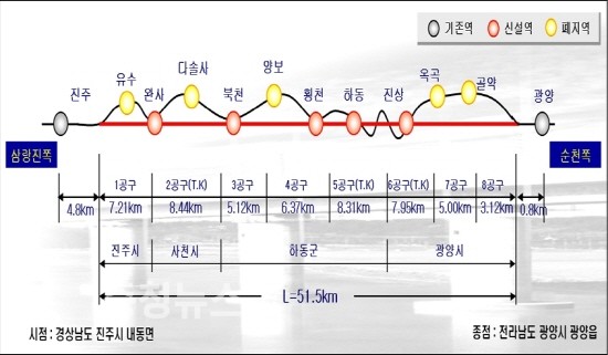 한국철도시설공단(이사장 강영일)은 영․호남 간 교류를 촉진하고 남해안축 철도망을 확충하기 위한 진주~광양 복선화 사업(51.5km)을 완벽하게 마무리하고 14일 개통한다로 밝혔다.