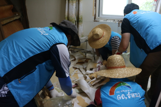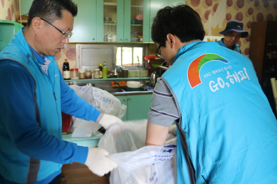 가만히 있어도 땀이 흐르는 더운 날씨였지만, 직원들은 집 수리가 신속하고 체계적으로 진행될 수 있도록 장비 및 자재를 옮기고 헌 벽지와 장판을 제거, 주택 주변 환경정화를 실시하는 등 적극적으로 집 수리를 도왔다. 윤재남 님께서는 “더운 날씨에 멀리까지 와서 고생한다.”며 고마운 마음을 전하였다.