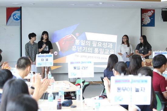 이날 통일탐구토론대회는 중ㆍ고등학교 학교급별로 나누어 실시됐다. 역할극, 노래, 뉴스 보도 형식 등 자신들만의 창의적인 방법으로 탐구 결과를 발표하고 다른 참가팀과의 질의응답을 통해 함께 토론해 가는 방식으로 진행됐다.