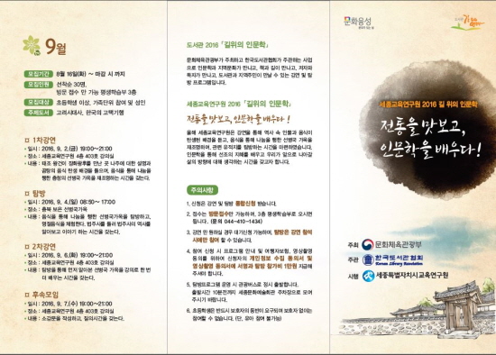 세종특별자치시교육연구원(원장 이현복, 이하 세종교육연구원)이 강연과 탐방이 융합된 체험형 강좌인 ‘전통을 맛보고, 인문학을 배우다’를 주제로 하는 2016년 ‘도서관, 길 위의 인문학’프로그램 참가자를 모집한다고 밝혔다.