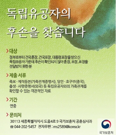 대전지방보훈청(청장 이명현)은 국가보훈처에서 훈장이 전수되지 못한 독립유공자의 후손을 찾아 훈장을 전수함으로써 조국독립을 위해 헌신하신 독립유공자에 대하여는 국가가 끝까지 책임진다는 의지를 실천하고 국민의 애국심 함양 및 독립유공자 후손의 자긍심 고취 및 유족의 생활안정을 위해『훈장 미전수 독립유공자 후손 찾기운동』을 추진하고 있다고 밝혔다.