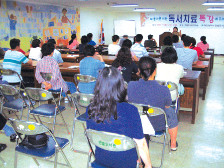 한밭도서관은 9월 13일부터 11월 15일까지 10주간 매주 수요일 오전 10시에 ‘독서치료 프로그램’을 운영한다고 밝혔다. 도서관측은 이에 앞서 지난 9월 9일 오후 2시 도서관 회의실에서 독서치료사인 홍근옥 강사를 초빙해 강연을 열었다. 홍근옥씨의 강연을 듣고 독서치료에 대한 이해를 높여 보았다.