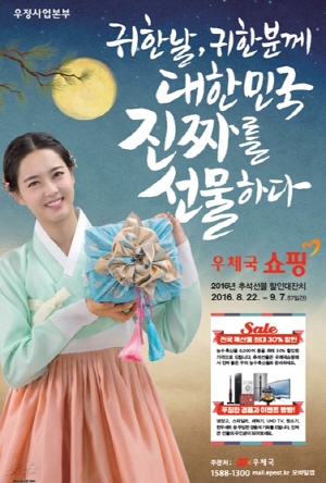 충청지방우정청(청장 이승재)은 추석 명절을 맞아 8월22일부터 9월7일까지 17일간 ‘2016년 추석선물 할인대잔치’를 열고 6,000여종의 우리특산물을 최대 30%까지 할인 판매한다고 밝혔다.