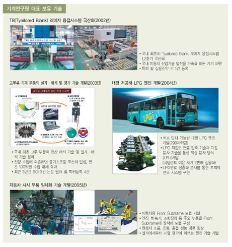 시스템 설계 기술, 바이오 기계 기술 등을 꼽을 수 있다. 또 사이버 엔지니어링 기술 개발, 기계 부품 신뢰성 평가 사업, 자기부상열차 개발,