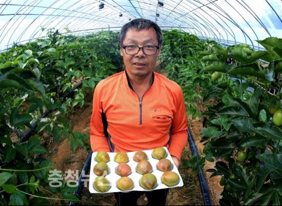 하지만 당진시농업기술센터가 새기술 시범사업의 일환으로 겨울철 동해피해와 여름철 고온피해를 방지하기 위해 관련 농가지도와 재배시설 개선을 추진해 면천면 사기소리 이구용(51세) 농가가 패션 프루트 재배와 수확에 성공했다.