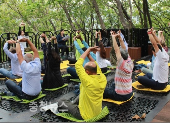 ▲ 국내외 참가자들이 개회식에 앞서 데크로드(툇마루 산책길)에서 산림치유 프로그램을 체험하고 있다.