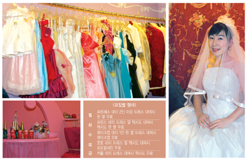 카페주인에 따르면. 지난 2월 개장한 이곳은 1만원이면 상상해마지 않았던 드레스를 입을 수 있다. 이 곳 드레스는 웨딩 디자이너인 카페주인의 큰 딸이 직접 제작한 옷이다. 따라서 최고의 정성이 들어갔으며 모두 새 옷으로 준비한 드레스로 오픈 했다. 또 드레스만이 아니라 이에 필요한 소품일체와 메이크업도구까지 있고 스튜디오와 조명까지 구비되어 있어 여자라면 정말 한번쯤 가볼 만하다.