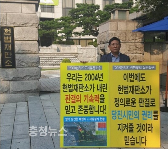 당진땅찾기 소송, 다음달 10일까지 42일간 릴레이 시위 전개 양창모 당진시의회 의원은 2일 서울 헌법재판소 앞에서 당진평택항일원 당진시 관할 당위성 호소를 위한 1인 피켓시위를 벌였다. ▲ 양창모 당지시의회 부의장 1인 피켓 시위 / 충청뉴스 최형순 기자 주로 출근시간과 점심시간을 겨냥해서 법조계까지 사태의 심각성과 정의로운 판결로 당진시민의 권리를 알리고자 활동을 전개했다. 저작권자 © 충청뉴스 무단전재 및 재배포 금지 최형순 기자 다른기사 보기 기사가 마음에 드셨나요? 충청뉴스 좋은 기사 후원하기 1,000원 3,000원 5,000원 10,000원 30,000원 50,000원 직접입력 비회원 약관동의하기 ※ 소중한 후원금은 더 좋은 기사를 만드는데 쓰겠습니다.