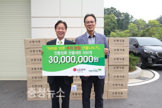 전달식에 참석한 성경호 LG화학기술연구원 총무팀장은 “직원들과 함께 정성껏 마련한 전통식품 선물세트를 대전지역의 어려운 가정에 나눌 수 있어 매우 기쁘게 생각한다. 한 해 동안 정성스레 수확한 음식물들을 가족들과 함께 나누는 풍성한 한가위에 이 선물세트가 도움이 되었으면 한다.”고 말했다.
