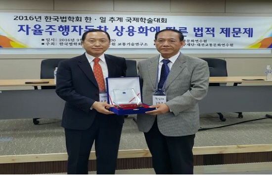 김원규 교수는 이날 한국법학회가 한국교통문화연구원과 공동으로 한국연구재단의 지원을 받아 대전교통문화연수원 소강당에서 개최한 ‘자율주행자동차의 상용화에 따른 법적 제 문제’라는 주제의 한・일 추계학술대회에서 연구업적을 인정받아 학술상을 수상했다.