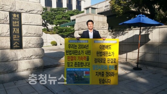홍기후 당진시의회 의원이 19일 서울 헌법재판소 앞에서 당진평택항 일원 당진시 관할 당위성 호소를 위한 1인 피켓시위를 펼쳤다.
