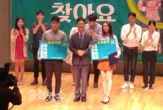 ▲ 세종대왕과 소헌왕후로 뽑힌 박세준씨(사진 왼쪽)와 이서은씨(사진 오른쪽)가 조수창 세종시 균형발전국장(사진 가운데)과 기념촬영을 하고 있다.