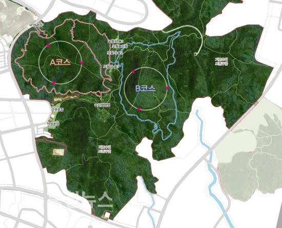 자연 지형을 그대로 살린 원수산 산악자전거 공원은 지형 특성에 따라 A코스(4.0km)와 B코스(3.4km)로 구분되었으며, A코스는 경사가 완만하고 평지가 대부분이어서 초보자도 부담 없이 이용할 수 있고, B코스는 지형의 변화가 심하고 경사가 급해 경험이 많고 전문성을 갖춘 중급자 이상의 수준의 이용자가 이용하기에 적합하게 조성되었다.