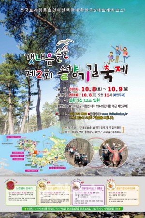 이번 축제에서는 4km와 6km 등 코스를 선택할 수 있는 솔향기길 걷기대회와 함께 △솔향기길 황금 솔방울 줍기 △솔향기길 명소 인증 샷 촬영 △솔향기 엽서 보내기 등 몸과 마음을 모두 만족시켜주는 다양한 행사가 진행된다.