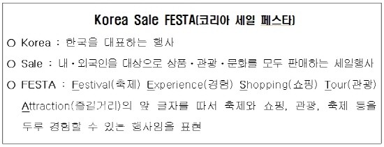 세종시는 정부가 범국가적으로 추진하는 대한민국 쇼핑관광축제‘코리아 세일 페스타(Korea Sale FESTA)’에 참여하여, 15일부터 18일까지 4일간 세종전통시장 ‘코리아 세일 페스타’를 개최한다.
