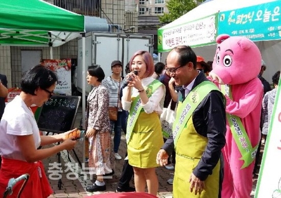 농협중앙회 충남지역본부(본부장 유찬형)는 한돈자조금관리위원회 (대한한돈협회 충남도협의회장 배상종)와 함께 7일 농협충남지역본부 후정 직거래 금요장터에서 한돈데이(10월 1일)를 기념하여 한돈 소비촉진행사를 개최하였다.