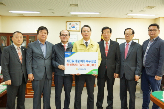농협중앙회 충남지역본부(본부장 유찬형)는 지진 및 태풍(차바)으로 피해를 입은 경북과 울산지역을 찿아 피해복구에 써달라며 성금 2000만원을 전달했다고 밝혔다.