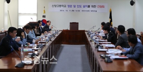 천안시의회(의장 전종한)는 11일 16시 천안시의회 대회의실에서 천안신당고등학교(교장 이하영) 앞 인도 설치를 위한 간담회가 열렸다.