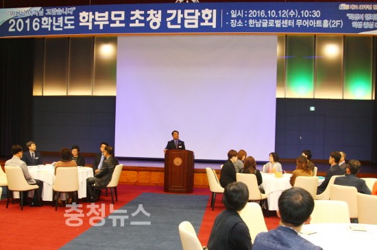 ▲ 한남대 이덕훈 총장이 학부모초청간담회에서 학부모들에게 인사말을 하고 있다.