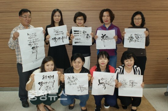 ▲ 수강생들이 작성한 붓글씨를 선보이고 있다. / 충청뉴스 최형순 기자