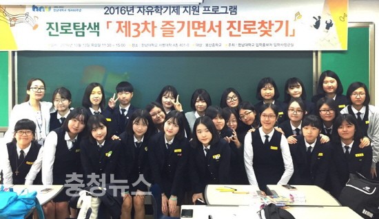 한남대는 13일 대전 봉산중학교 학생 30명을 초대해 2016년 중학교 자유학기제 프로그램인 ‘제3차 즐기면서 진로찾기’를 진행했다고 14일 밝혔다.