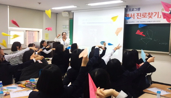 한남대 사범대 강의실에서 진행된 이번 프로그램은 중학생 30명이 소그룹을 지어 자신의 적성에 맞는 직업을 찾아보는 직업 카드놀이, 자신의 꿈을 홍보하는 시간, 의류학과 학과 체험 순서로 진행되었다.