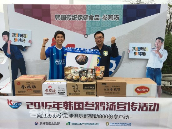농림축산식품부(장관 김재수)와 한국농수산식품유통공사(aT, 사장 여인홍)는 지난 15일 중국 난징에서 중국 프로축구 시장의 2억 치우미들을 대상으로 우리 삼계탕의 우수성을 홍보하기 위한 스포츠마케팅 행사를 국내 최초로 개최했다.