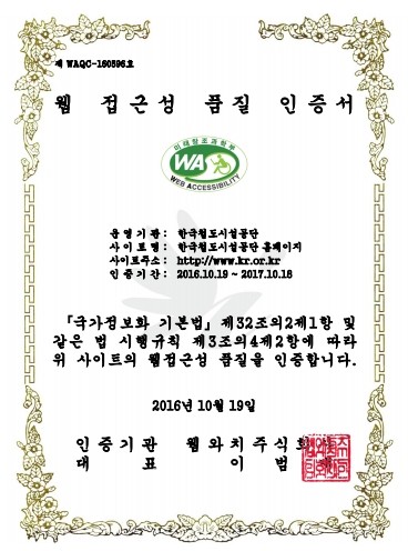 한국철도시설공단(이사장 강영일)은 장애인과 고령자도 홈페이지를 쉽고 편리하게 이용할 수 있도록 공단 홈페이지(http://www.kr.or.kr)의 웹 접근성을 개선하여 국가공인 인증기관으로부터 2년 연속 품질 인증을 획득했다고 밝혔다.
