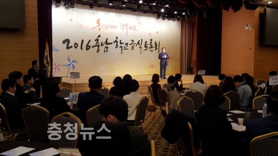 충남도교육청(교육감 김지철)은 26일 덕산 리솜 스파캐슬에서 학교장, 학부모, 지방자치단체와 학교급식지원센터 담당자, 생산자 등 총 300여명이 한자리에 모여 “통(通)해서 행복해요” 2016 학교급식 대토론회를 개최했다고 밝혔다.