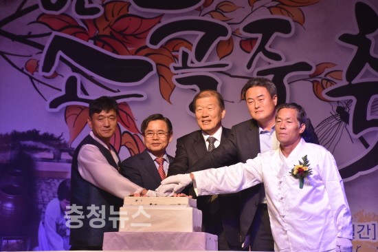 ▲ 노박래 서천군수와 조남일 서천군의회 의장, 나장연 한산소곡주추진위원장 등 이 케이크 절단 세리모니를 하고 있다.