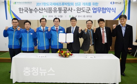 한국농수산식품유통공사(사장 여인홍, aT)와 완도군(군수 신우철)은 10월 31일(월) 전남 나주 aT 본사에서 ‘2017 완도국제해조류박람회’의 성공적인 개최와 상호 협력을 위한 업무협약을 체결했다고 밝혔다.