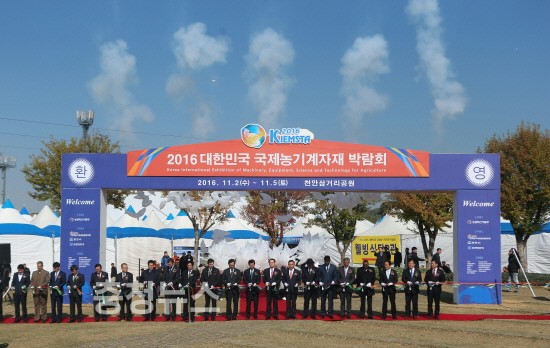 ‘2016 대한민국국제농기계자재박람회’가 2일 오전 10시 김재수 농림축산식품부장관, 허승욱 충청남도 정무부지사, 구본영 천안시장, 전종한 천안시의회 의장, 지역 국회의원 등 주요내빈과 업체관계자, 관람객 등 5000여명이 참석한 가운데 개막식을 갖고 첫날 관람객을 맞았다고 밝혔다.