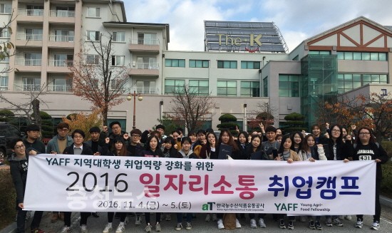 한국농수산식품유통공사(사장 여인홍, aT)는 정부 국정과제이자 사회적 이슈인 청년일자리 창출에 기여하고 급변하는 채용시장에 대한 최신 취업정보를 제공하기 위하여, 11월 4일부터 5일까지 이틀간 전남 구례에서 ‘2016 일자리소통 취업캠프’를 개최하였다.
