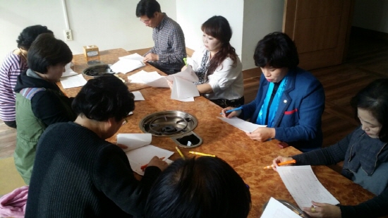 ▲ 김미경 계룡시의원을 비롯한 문인협회 회원들이 모여 원고를 심사하고 있다.