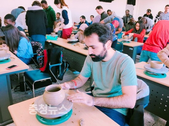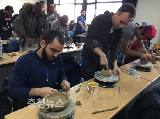 하늘강 아틀리에 신정숙 대표가 물레를 돌리며 도자기 빚는 시범에 이어 유학생들은 둥근 흙덩이로 각자 좋아하는 다양한 모양의 도자기를 직접 만들어 보는 체험을 했다.