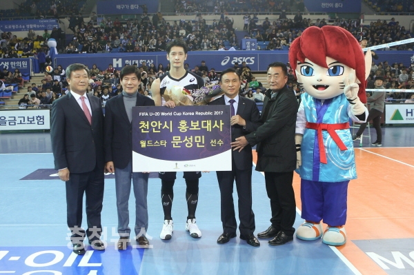 충남 천안시는 11월 15일 유관순체육관에서 열린 현대캐피탈 VS OK저축은행과의 홈경기에서 천안시 연고팀인 현대캐피탈 스카이워커스배구단의 문성민 선수를 U-20 월드컵 천안시 홍보대사로 위촉했다고 밝혔다.