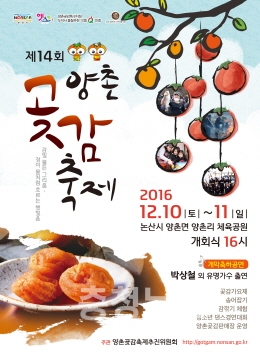 충남 논산시는 2016 양촌곶감축제가 오는 12월 10일부터 11일 이틀간 양촌리 체육공원에서 ‘감빛 물든 그리움 정이 물처럼 흐른 햇빛촌’을 주제로 다채롭고 풍성하게 열린다고 밝혔다.