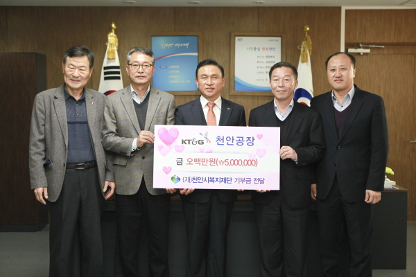 KT&G 천안공장은 17일 천안시청에서 주요관계자들이 참석한 가운데 사회적 취약계층지원을 위한 500만원 지정후원금 전달식을 가졌다.