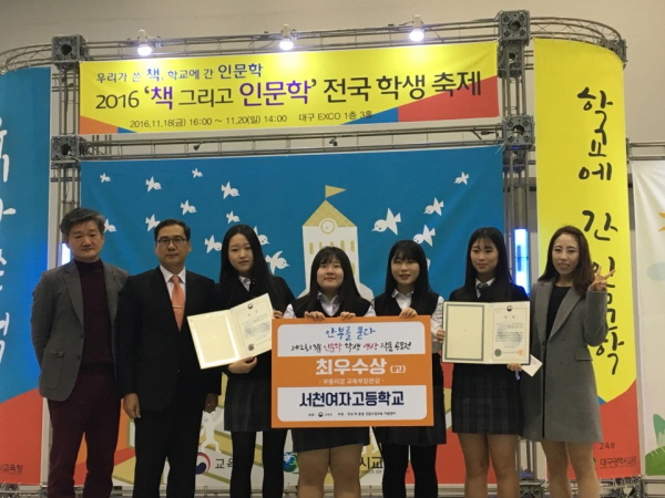 충남교육청(교육감 김지철)이 교육부가 주최하고 대구광역시교육청이 주관한 2016 ‘책 그리고 인문학’ 전국 학생 축제에 4개 학교가 부스 운영과 상설체험 행사진행, 우수사례 발표를 했으며, 같이 열린 제2회 3분 인문학 학생 영상 작품 공모전 시상식에서 서천여고가 최우수상, 논산동성초가 우수상을 수상했다고 20일 밝혔다.